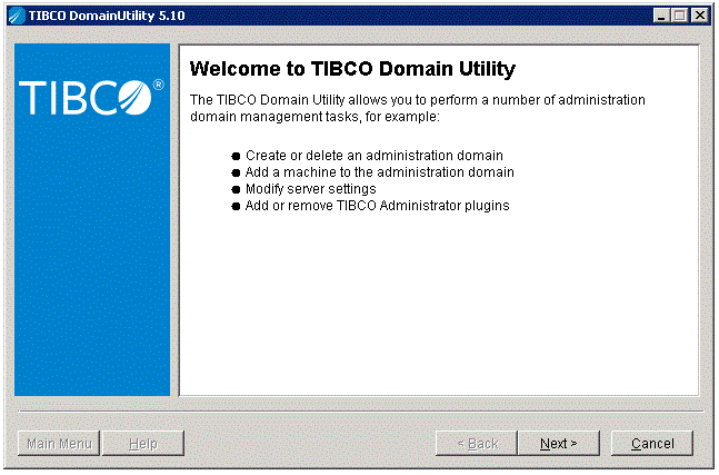 The next diagram shows the Domain Utility main page. Clicking the Cancel button closes Domain Utility. After you have selected a task, the Main Menu button becomes active.