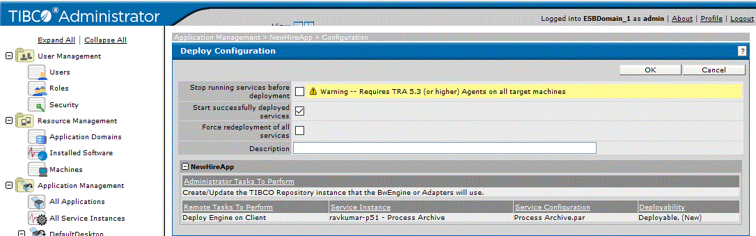 If a service is registered to the cluster software as auto-restarted if failed, when the service is redeployed using the TIBCO Administrator GUI, the Stop running service before deployment option should be cleared (as shown in the next diagram).