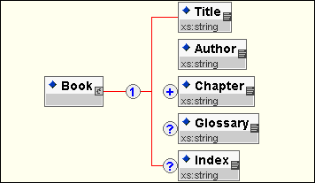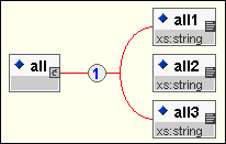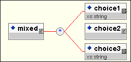 Table 8 XML Menu Options Elements are displayed as objects (in boxes) within the content model diagram. The boxes contain element names, data type indicators, and occurrence indicators. An element’s content model may be composed of text, other elements, text and elements, data, or none of these (as defined in the element definition). The icons used in the content model diagram are illustrated in Figure 11.Figure 11 Content Model DiagramSequence indicator symbols do not appear in the content model diagram, but they are implied. Sequence content models are represented by right-angle brackets, with elements listed in the order that they must appear. Figure 12 illustrates the presentation of an element named sequence.Figure 12 Diagram for a SequenceElements that are separated by the 'or' symbol ('|') in the content model appear to the right of the parent element, after two diagonal branch indicators, in the order they appear in the content model. Figure 13 shows the representation of an element named choices with the content model (choice1 | choice2 | choice3).Figure 13 Diagram for ChoiceOccurrence indicator symbols are used to identify how often an element may or must appear and are shown in the content model diagram. If occurrence indicators apply to a group of elements, the elements are illustrated in the content model diagram as branching off an occurrence indicator symbol. Figure 14 shows a content model similar to that presented in Figure 13, but with the group of choices made optional and repeatable. The multichoice element has the content model (choice1 | choice2 | choice3)*.Figure 14 Optional and Repeatable Set of ChoicesIf an occurrence indicator applies only to a single element, it appears appended to the box with the element name. Figure 15 shows a possibilities element whose content model contains all the occurrence indicators: (seq1, choice1?, choice2+, choice3*).Figure 15 All Occurrence IndicatorsMixed declarations always offer a choice of elements that are both optional and repeatable. These appear as the mixed element shown below in Figure 16. Note that the mixed element may contain both text and elements.Figure 16 Mixed Content ModelFor Schema resources, if a content model is defined as all, a conforming document must contain exactly one of each element specified in the content model (or zero if an element is specified as optional), with the elements occurring in any order. (Elements within an all content model cannot be repeatable.) Figure 17 illustrates the all content model (all1 & all2 & all3), represented with an arc.Figure 17 All Content ModelThe content model diagram also provides navigation to the specifics about a particular element or attribute. To scroll to an element's type definition in the list of elements, right-click on the element while browsing the element in the content model diagram. A context-sensitive menu appears. Click the Go to Element Name option, and the selected element is made active in the list of element definitions.