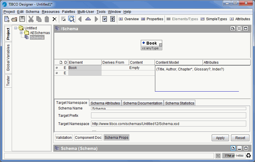 You can access the schema editing panels by using a set of toolbar buttons or the Schema menu. The available tools combine to present a consistent view of your schema. Figure 2 illustrates the editing environment for Schema and DTD resources.For example, to create an element called Book for a schema describing the structure of a book (which may contain elements such as a title, author, chapters, sections, glossary, index, and so on), follow these steps:
