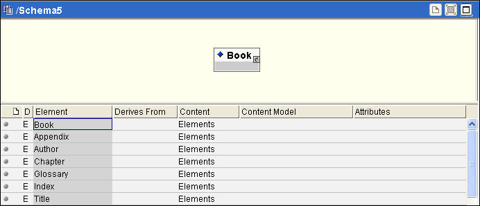 The Content Model/Data Type column displays the content model of the elements and provides a set of tools for creating and editing content models and data types. (The name of this column is either Content Model or Data Type, depending on the content type set in the Content column.) Users who are comfortable with occurrence and sequence indicator syntax can enter element content models directly by typing them in the Content Model column. For users not yet comfortable with occurrence and sequence indicators, a series of buttons are provided to help the user create and edit content models. See