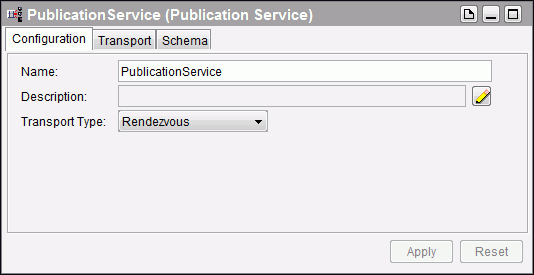 2. In the palette panel, select one of the services, for example, a Publication Service, and drag it into the design panel.Figure 103 Configuration Tab