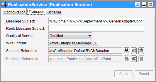 4. To provide some additional information about the transport, click the Transport tab. What is displayed depends on the transport type you selected for the service. The screen shot below shows the options available for the default transport, a TIBCO Rendezvous Certified transport. See Services Reference for detailed information on the individual services and different Transport tab content.Figure 104 Transport Tab