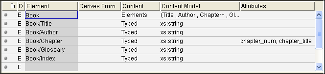 5. Tab to the Content Model column and type in the content model of the book. A simple content model for Book might look like the one shown below. See Elements/Types Panel and Example: Building a Content Model, for more information on how to build a content model.Figure 4 Building Content Model