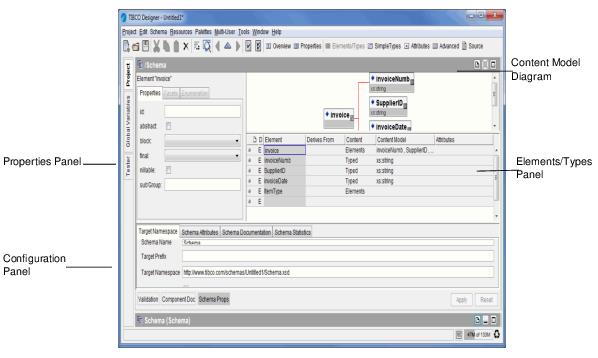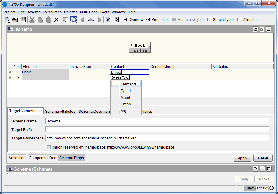 You can access the schema editing panels by using a set of toolbar buttons or the Schema menu. The available tools combine to present a consistent view of your schema. Figure 2 illustrates the editing environment for Schema and DTD resources.For example, to create an element called Book for a schema describing the structure of a book (which may contain elements such as a title, author, chapters, sections, glossary, index, and so on), follow these steps: