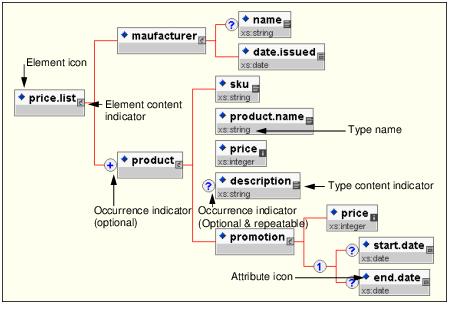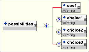 Table 8 XML Menu Options Elements are displayed as objects (in boxes) within the content model diagram. The boxes contain element names, data type indicators, and occurrence indicators. An element’s content model may be composed of text, other elements, text and elements, data, or none of these (as defined in the element definition). The icons used in the content model diagram are illustrated in Figure 11.Figure 11 Content Model DiagramSequence indicator symbols do not appear in the content model diagram, but they are implied. Sequence content models are represented by right-angle brackets, with elements listed in the order that they must appear. Figure 12 illustrates the presentation of an element named sequence.Figure 12 Diagram for a SequenceElements that are separated by the 'or' symbol ('|') in the content model appear to the right of the parent element, after two diagonal branch indicators, in the order they appear in the content model. Figure 13 shows the representation of an element named choices with the content model (choice1 | choice2 | choice3).Figure 13 Diagram for ChoiceOccurrence indicator symbols are used to identify how often an element may or must appear and are shown in the content model diagram. If occurrence indicators apply to a group of elements, the elements are illustrated in the content model diagram as branching off an occurrence indicator symbol. Figure 14 shows a content model similar to that presented in Figure 13, but with the group of choices made optional and repeatable. The multichoice element has the content model (choice1 | choice2 | choice3)*.Figure 14 Optional and Repeatable Set of ChoicesIf an occurrence indicator applies only to a single element, it appears appended to the box with the element name. Figure 15 shows a possibilities element whose content model contains all the occurrence indicators: (seq1, choice1?, choice2+, choice3*).Figure 15 All Occurrence IndicatorsMixed declarations always offer a choice of elements that are both optional and repeatable. These appear as the mixed element shown below in Figure 16. Note that the mixed element may contain both text and elements.Figure 16 Mixed Content ModelFor Schema resources, if a content model is defined as all, a conforming document must contain exactly one of each element specified in the content model (or zero if an element is specified as optional), with the elements occurring in any order. (Elements within an all content model cannot be repeatable.) Figure 17 illustrates the all content model (all1 & all2 & all3), represented with an arc.Figure 17 All Content ModelThe content model diagram also provides navigation to the specifics about a particular element or attribute. To scroll to an element's type definition in the list of elements, right-click on the element while browsing the element in the content model diagram. A context-sensitive menu appears. Click the Go to Element Name option, and the selected element is made active in the list of element definitions.