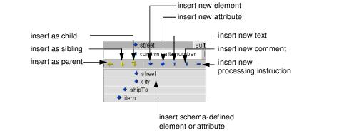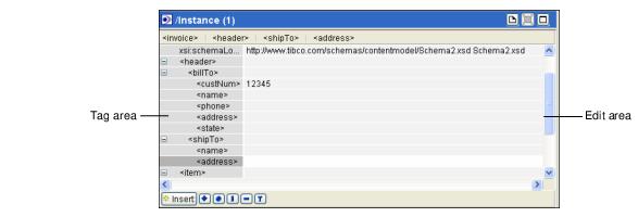 For step-by-step XML Schema building exercises, see XML Schema Exercises. To build a sample DTD, see DTD Exercise.Figure 8 Instance Editing EnvironmentFigure 9 Tag Area and Edit Area
