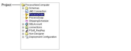 A project contains resources that implement the enterprise integration. This includes services (producers and consumers of information), any business logic that may be applied to that information, and deployment information.