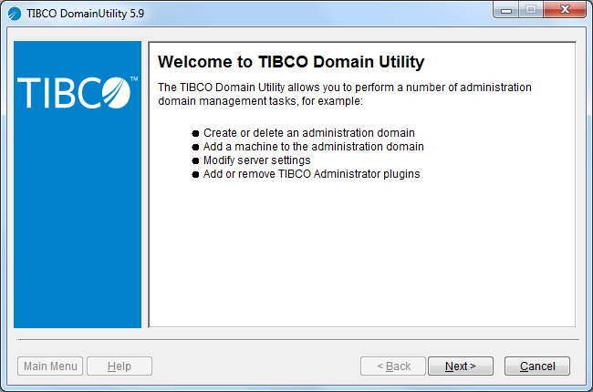 The next diagram shows the Domain Utility main page. Clicking the Cancel button closes Domain Utility. After you have selected a task, the Main Menu button becomes active.