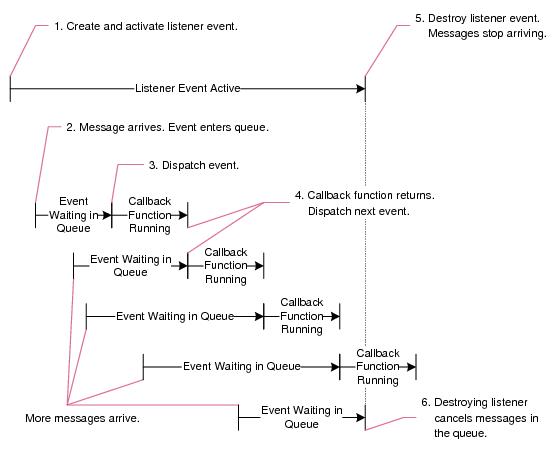 not deactivate the listener when it places new message events on the queue (in contrast to timer and I/O events, which are temporarily deactivated). Consequently, several messages can accumulate in the queue while the callback function is processing.