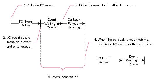 reactivates the event. In this way, only one reference to the I/O event can appear in a queue at any moment in time. (References to several I/O events can appear simultaneously, but two references to the same event cannot appear at the same time.)