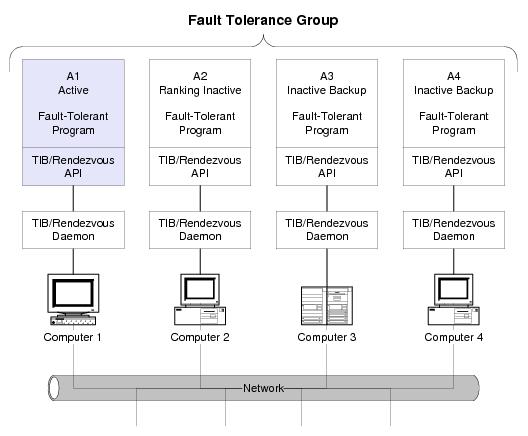 Figure 19 illustrates the components of a fault-tolerant distributed program in a typical network operating environment. Four identical program processes (A1, A2, A3, A4) run on four separate computers, connected by a network. The program incorporates the Rendezvous API library (including fault tolerance and communications software); a Rendezvous daemon process mediates between each program process and the network.Figure 19 Fault Tolerance Operating Environment