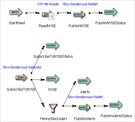 This section discusses how to use the TIBCO Rendezvous Subscribing Input Adapter in a StreamBase application. As shown in the lower left corner of the diagram below (depicting one of the adapter's sample applications), the subscribing adapter has no input ports and two output ports to communicate with the surrounding application.