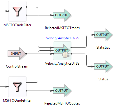 This section demonstrates how to use the Velocity Analytics UTSS Output adapter in a StreamBase application, and describes the use of the adapter's ports. By default, the adapter provides one input port. As shown in the EventFlow diagram below (from one of this adapter's sample applications), the adapter can communicate with the surrounding application by means of a configurable number of input ports, plus optional statistics and status output ports. As with other StreamBase adapters and operators, you can optionally enable an Error Output Port.