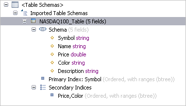 The following example shows an imported table schema with its table fields and index entries expanded.