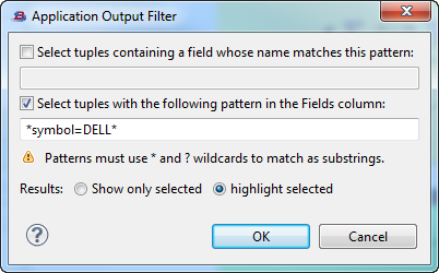 Select this option to narrow the list of tuples in the Application Output view. Only the tuples matching the specified filter settings are shown.