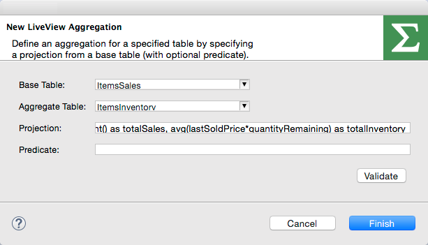 Use the New LiveView Aggregation wizard to create an aggregation between two existing Data Tables. The starting Data Table is called the Base Table. Before running this wizard, create a new Data Table with a similar schema to the Base Table.