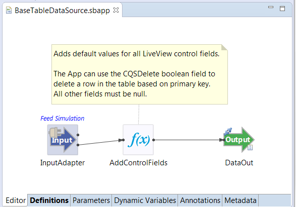 When you click , the wizard opens the newly generated EventFlow application, with a note attached to remind you of the next steps. You can eventually replace the Feed Simulation adapter with whatever EventFlow logic is needed to feed your particular table.