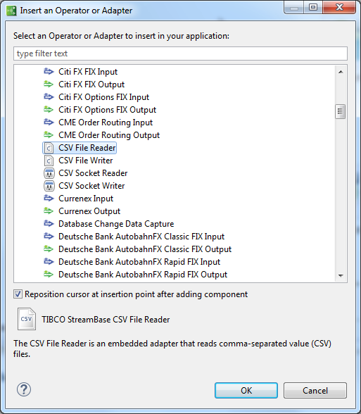 The Insert Adapter dialog can also be used efficiently with keystrokes only. For example, to insert a CSV File Reader adapter icon, with an EventFlow Editor active, type: a  i  csv  Down-arrow  Down-arrow  Enter
