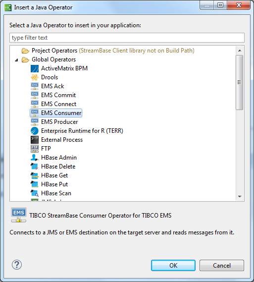 Dragging the Adapter, Java Operator icon to the canvas opens a dialog from which all Input adapters, Output adapters and Java operators are available. The keyboard shortcuts limit available choices in the dialog to the appropriate set of adapters or operators.