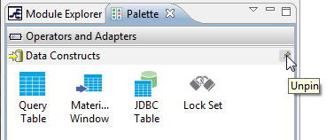 The Palette view is displayed when you have an EventFlow application open in the EventFlow Editor. By default it opens in the lower left corner of the SB Authoring perspective, but as an alternative, the Palette can be docked inside the EventFlow canvas. The Palette provides easy access to StreamBase components, which you drag and drop onto the canvas to add to your application.