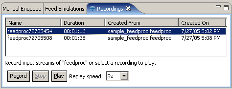 For related information, see Recording and Playing Back Data Streams. It explains how to use the Recordings view in StreamBase Studio, or the command-based sbrecord and sbfeedsim commands in a terminal or StreamBase Command Prompt.
