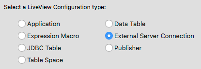 Use this selection to specify that the external data source is TIBCO ActiveSpaces. Run the LiveView ActiveSpaces sample to learn more about using this external data source.