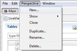 LiveView Desktop perspectives allow you to customize your available views. Every perspective stored in your workspace has a layout and a name. Within every default LiveView Workspace, you have a default perspective named Main. You can return to the Main perspective by clicking the Main button in the top-left corner of the desktop.