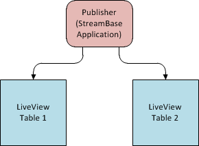 An embedded publisher can publish data to tables without those tables being configured to call the publisher. This means that the lvconf files for individual tables do not need to have data-sources individually configured. Compare ItemsSales.lvconf from the Hello LiveView sample to ItemsSales.lvconf in the publisher sample. In the publisher sample, the ItemsSales table gets data from the configured publisher. The table's lvconf file does not have a data-source configured: