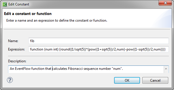 (pow((1+sqrt(5))/2,n)-pow((1-sqrt(5))/2,n)))}You can add a function as an output expression in, for example, a Map operator, and use it downstream. For generality, however, instead of specifying it as a field grid expression, you can define a function with module scope. To do that, enter the function in the dialog on the Definitions tab of a module, as shown below.