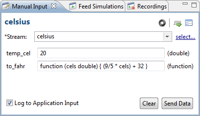 This example describes creating a new EventFlow application that uses a function in two ways to convert temperatures in Celsius to temperatures in Fahrenheit. In the first section, the function is an expression in an input stream. In the second section, the function is a module definition.