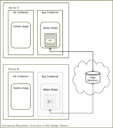 Each running server always has an ha container, and one of the servers also has an app container. The hadisk application running in each ha container makes sure that one and only one qtapp is running. The qtapp has the lock required to have access to the data on disk.