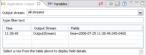 The Application Output shows the timestamp tuple that is sent on startup as output, which is similar to the following: