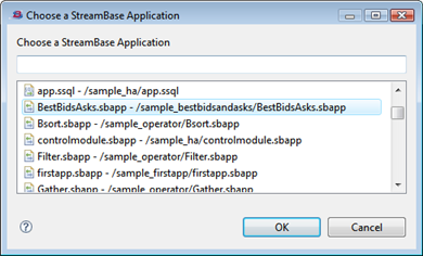 Specify the path to the StreamBase EventFlow, StreamSQL application file, or StreamBase deployment file to be run, debugged, or traced. Paths are measured from the root of the current Studio workspace. The easiest way to enter the correct path format is to browse for an application file using the button. The resulting dialog shows a list of all EventFlow, StreamSQL, and deployment files in your workspace. Select the one you want and click OK.