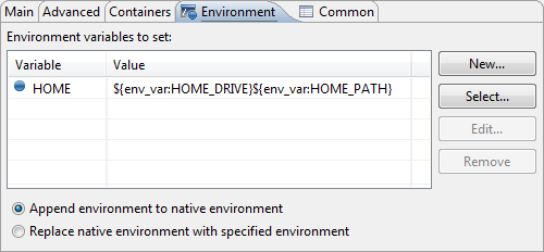The settings in the Environment tab are common to all Eclipse launch configurations. Use Eclipse Help to learn how more about these options. Use the Environment tab to specify or override environment variables with which to launch the application specified in the Main tab.