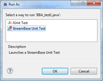 The first time the test is run, Studio prompts you to specify whether this is a standard JUnit test for Java code, or a StreamBase JUnit test for a StreamBase module. Select StreamBase Unit Test and click .
