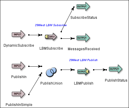 Connect an input and output stream to the adapter's input and output ports, respectively. Configure the schema of input stream with the fields required in the LBM messages to be published. Include a Topic field of type string if the default value for the Topic Field Name property is to be used.