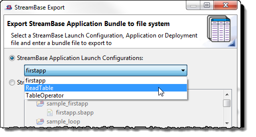 In the Export dialog, open the StreamBase folder, then StreamBase Application Bundle.