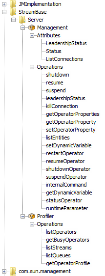 StreamBase Server is instrumented with a JMX-compliant Managed Bean that provides access to status information and provides control methods similar to the sbadmin command. This allows the server to be visible to JMX-compliant network management tools such as Java JConsole or HP Openview.
