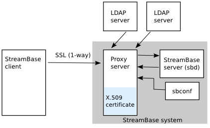 A single, signed X.509 certificate and keystore are configured on the StreamBase system's proxy server. The proxy server accepts the client. User names and passwords can be stored in either an LDAP server or in the