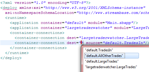 Press Ctrl+Space between the quotes for the value of the dest or source attributes of the <container-connection> element, and the Editor shows a list of container-qualified names of the top-level streams in all modules in the module search path. Intermediate streams are not listed, even if marked with the Always expose stream for dequeue option.