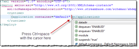 The Editor is aware of XML namespaces. When you create a new, blank deployment file, Studio places two namespace declarations placed in the top-level <deploy> element. These declarations are what direct the Editor to Studio's internal copy of the deployment file schema. Do not edit or remove the namespace declarations, or Studio may not be able to provide schema-aware assistance while editing.