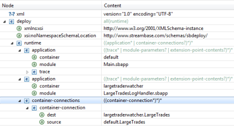 The Deployment File Editor is a validating XML editor that is aware of the schema that defines the XML syntax of StreamBase deployment files. Take advantage of the following features while editing your deployment files: