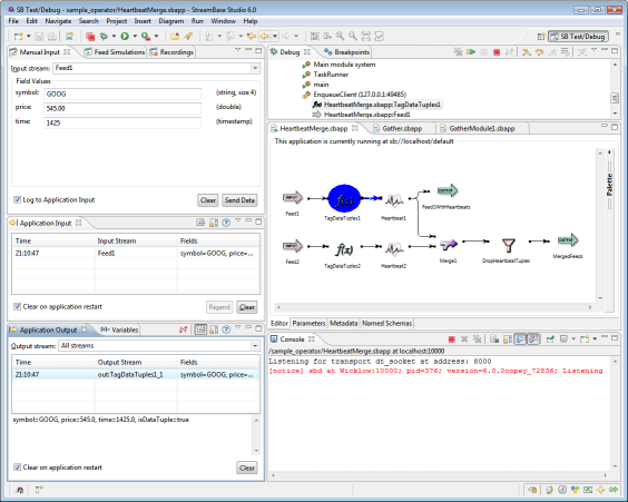You can resize the individual windows and StreamBase Studio saves your display preferences. The following screen shows the default SB Test/Debug layout in a debugging session, stopped at a breakpoint: