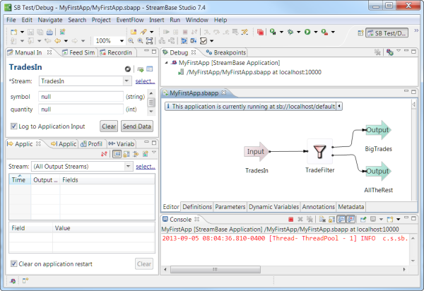 You can also run your application with sbd from a terminal window while working in StreamBase Studio. However, that method is beyond the scope of this tutorial. That topic and many others are covered in the other sections of StreamBase Help, including the instructions for most of the samples shipped with StreamBase.