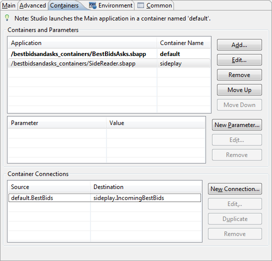 When you specify container connections with the Run Configuration dialog, the connection is stored with the launch configuration for use in Studio only, and not as part of the EventFlow XML. To specify the same containers and connections for running the same application at the command prompt, you must re-specify the container and connections in the server configuration file or with another method.