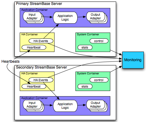When you enable automatic HA processing, StreamBase creates a container named ha on StreamBase Server. This newly created ha container has an application that tracks the leadership status between two specified servers. See Automatic HA, Using Control Stream Features and High Availability Sample.