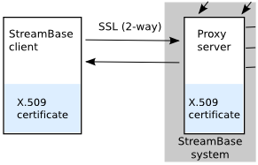 The next diagram shows a detail of a similar system with a two-way SSL connection, where both the StreamBase client and proxy server have a certificate: