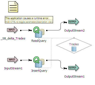 This error situation is shown in the following fragment, where the Trades table has a delta stream _SB_delta_Trades, but the ReadQuery operator attempts to read from the Trades table after the delta stream: