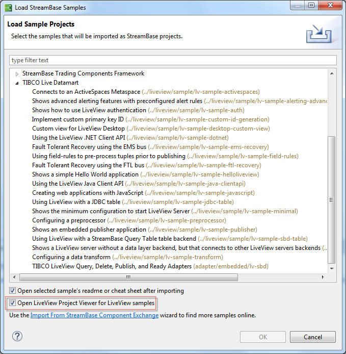 When you open → , select one of the TIBCO Live Datamart samples, and leave the Open LiveView Project Viewer check box selected.